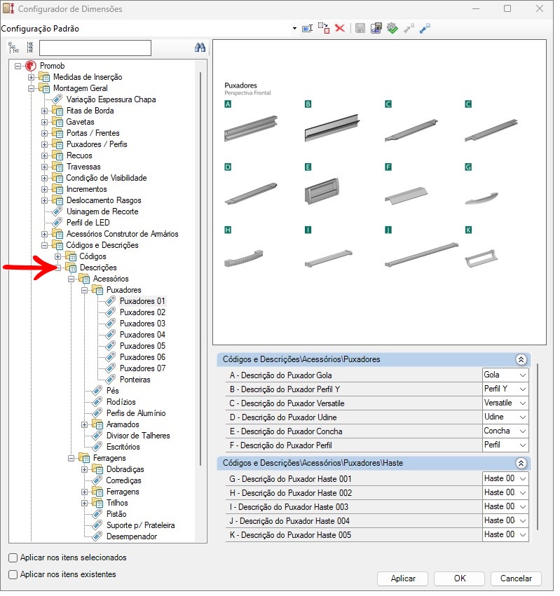 5. Alterados os valores no Configurador de Dimensões para os puxadores Udine e Versatile. Ambos não alteravam o valor do atributo. (1737967)