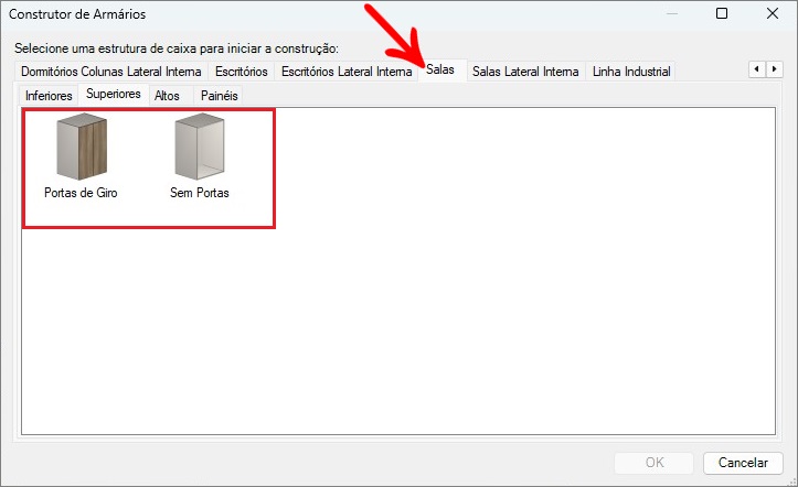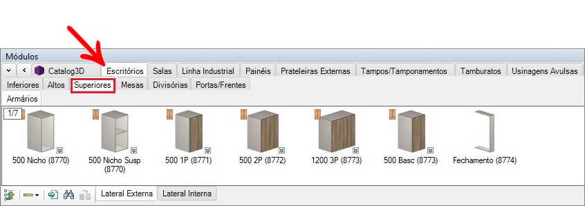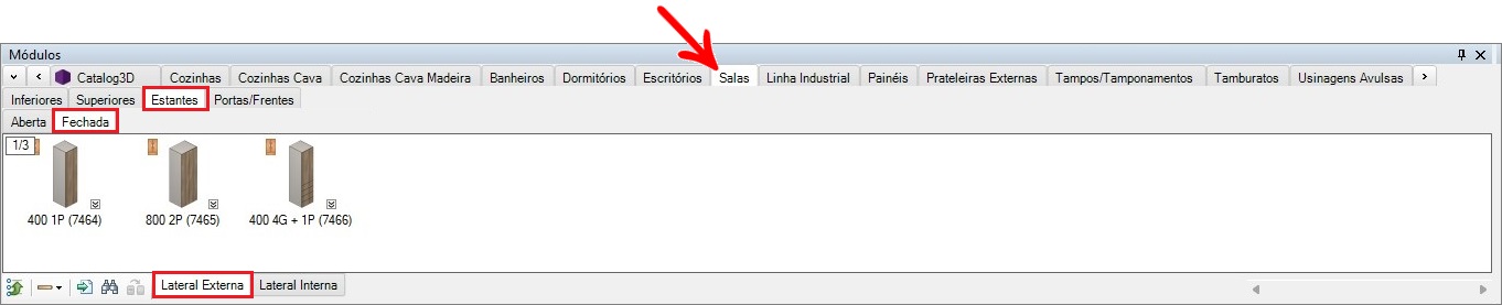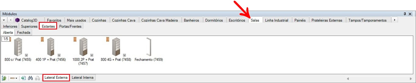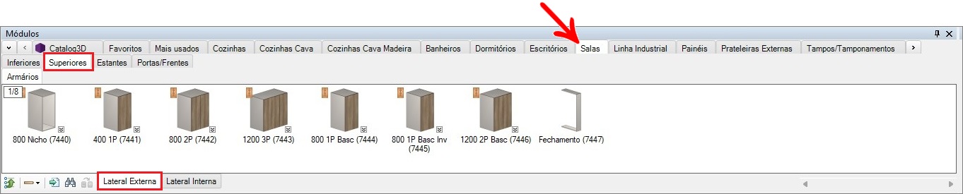 1. Incluída nova aba Superiores e Estantes na linha Salas, com módulos de armários superiores e estantes abertas e fechadas. Os módulos estão organizados em duas categorias: Lateral Externa e Lateral Interna. Configuração disponível nos seguintes caminhos:
