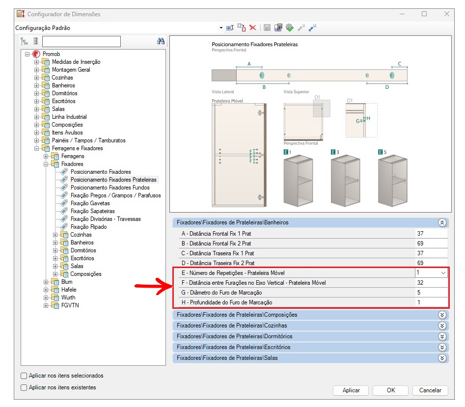 1. Disponibilizado novos parâmetros para adicionar pontos de fixação editáveis na prateleira móvel nas seguintes linhas, Cozinhas, Banheiros, Dormitórios, Escritórios, Salas e Composições. A edição pode ser feita através do seguinte caminho: