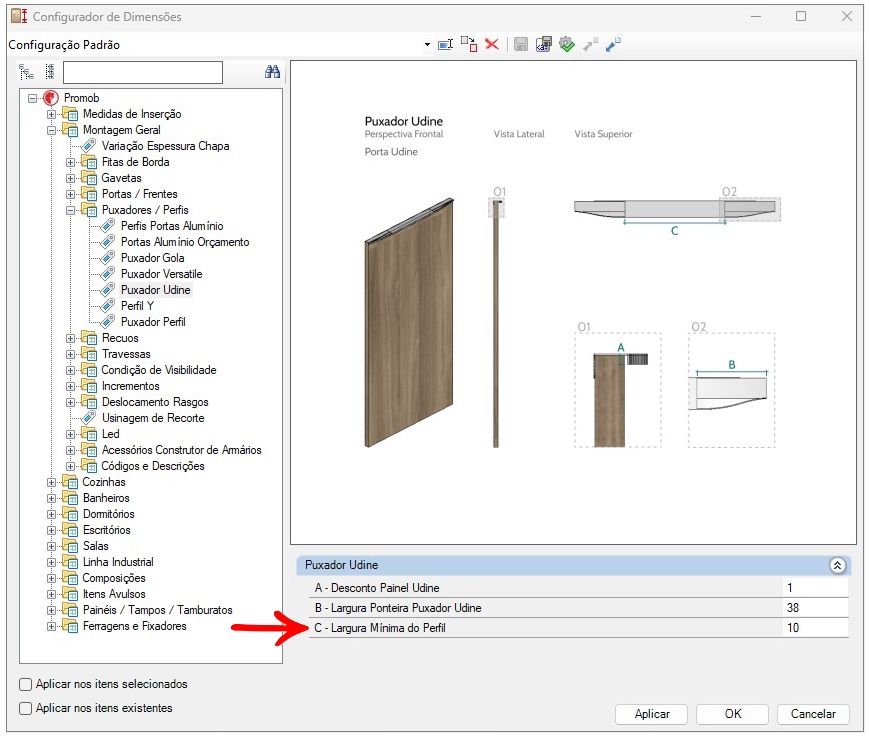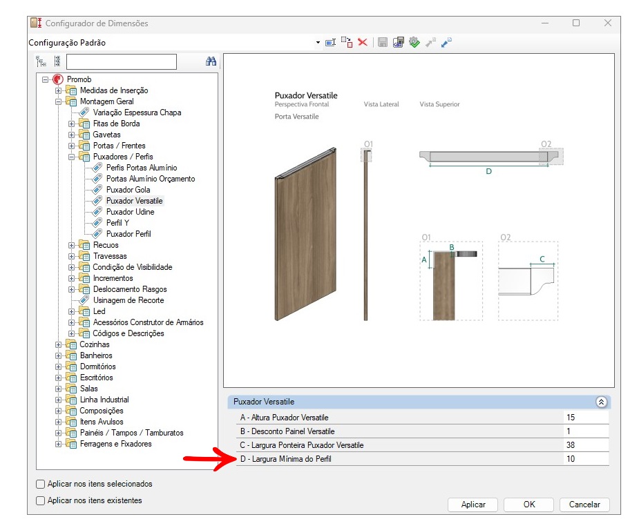 1. Disponibilizado novo parâmetro para configurar o valor mínimo dos perfis dos puxadores Versatile e Udine. É possível configurá-lo pelo caminho: