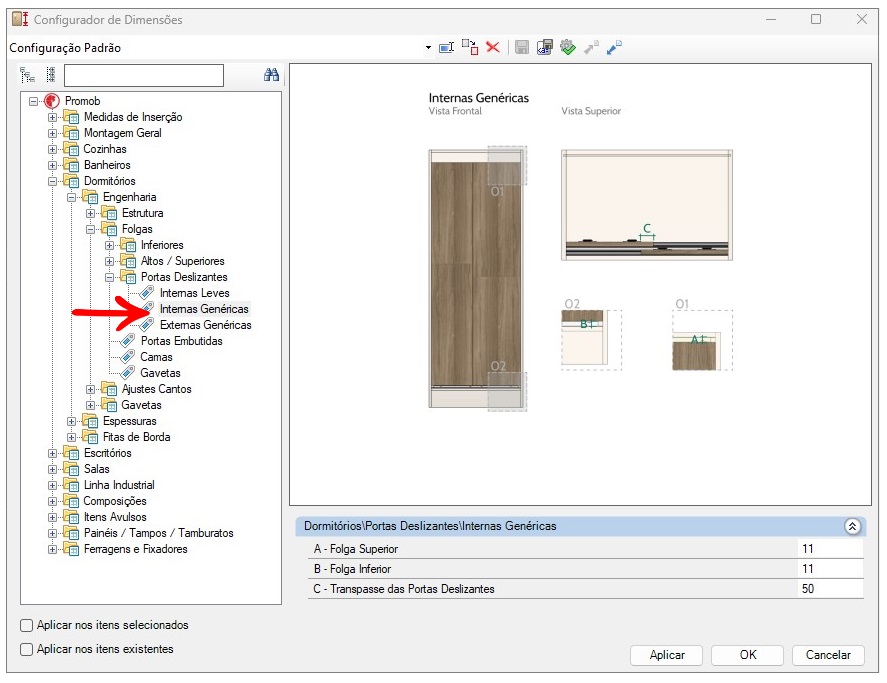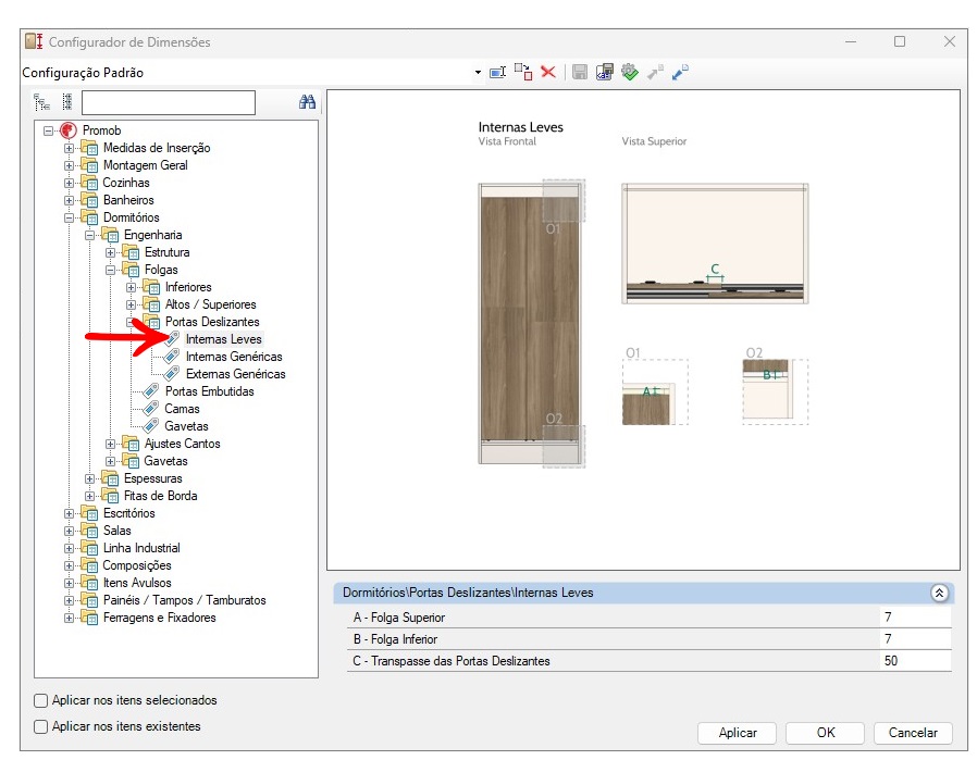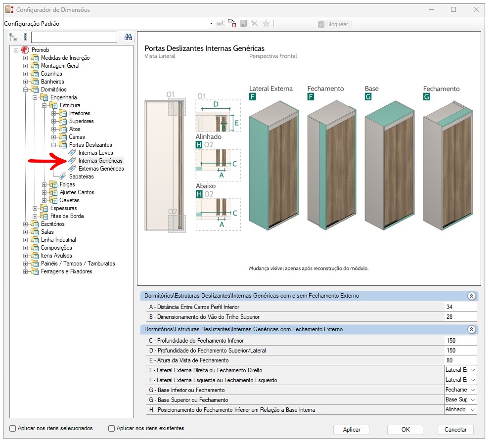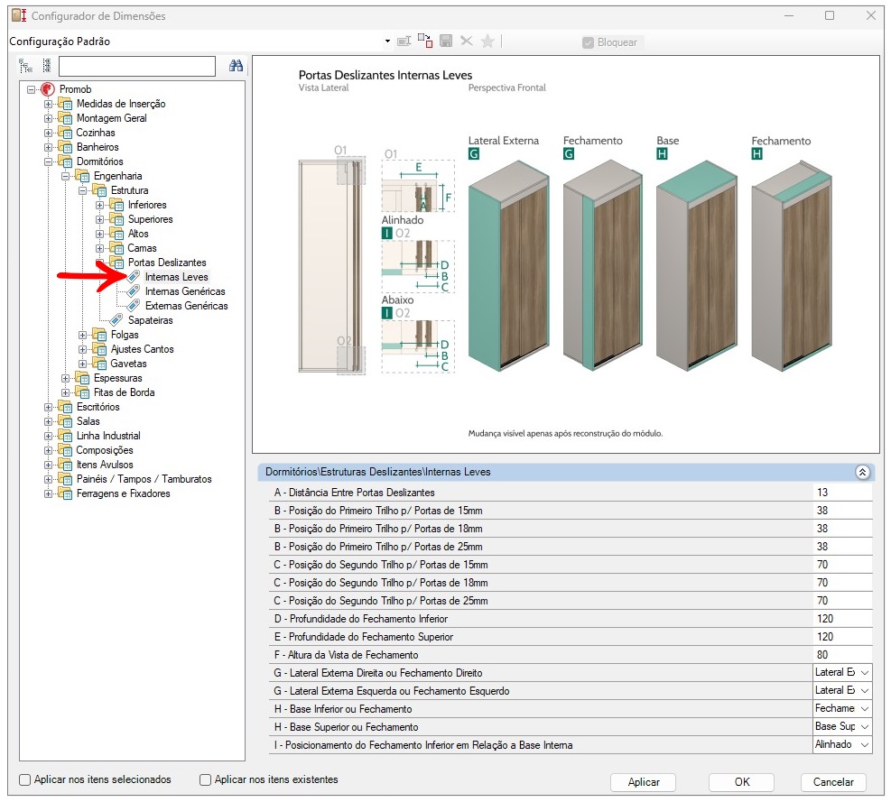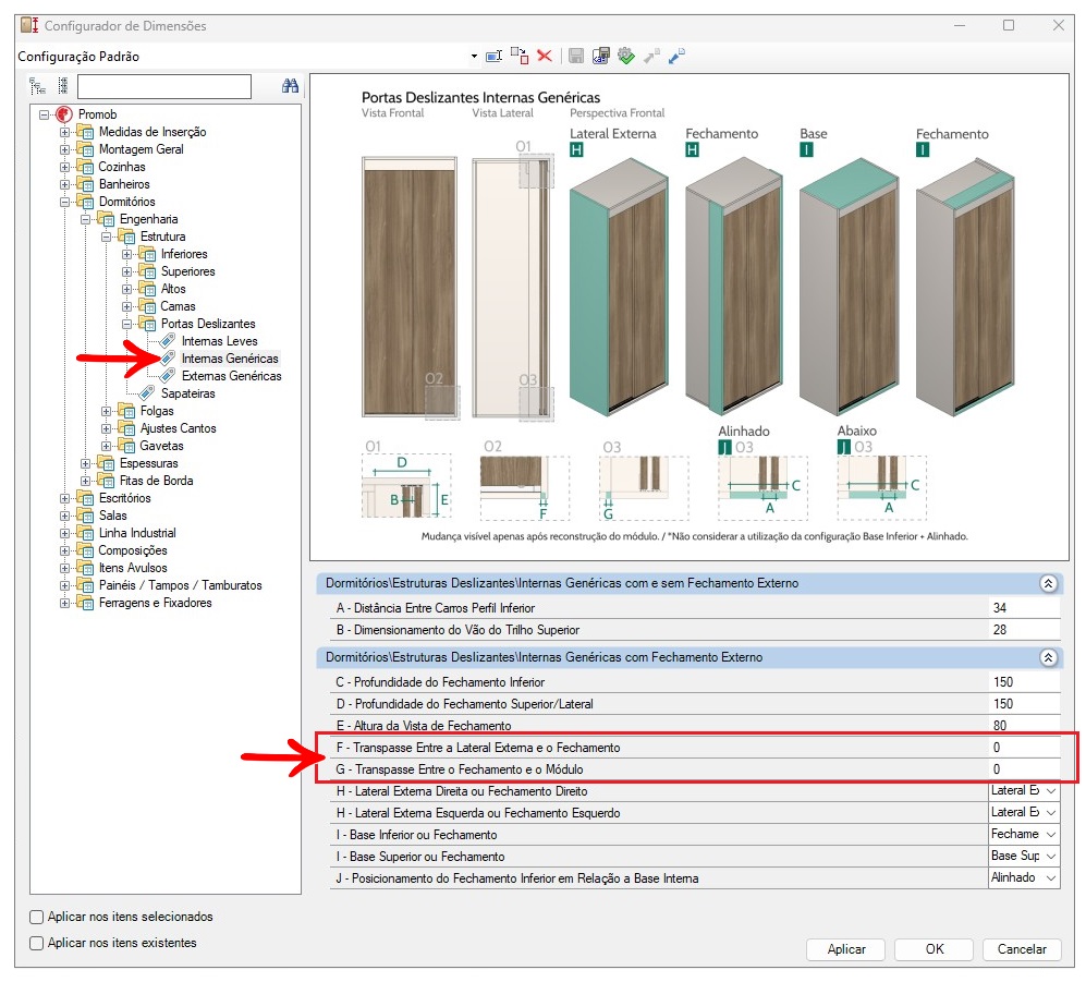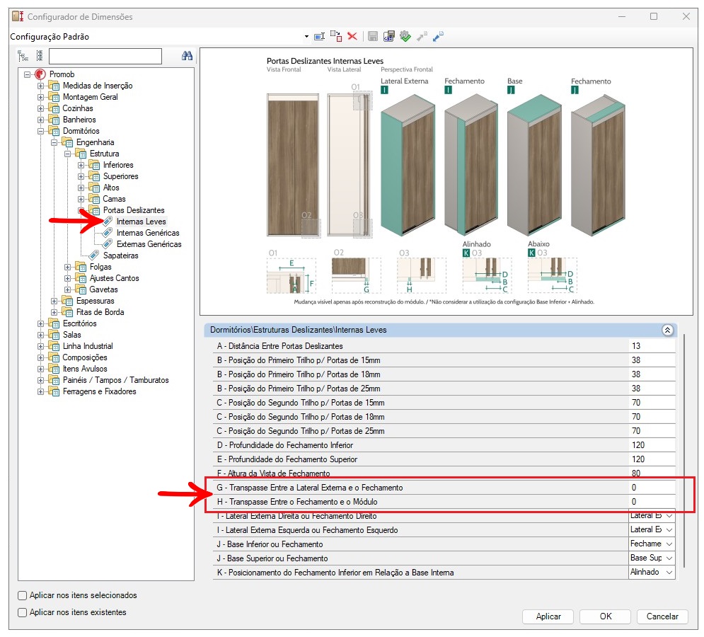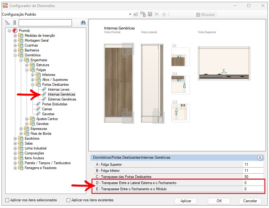 1. Em Dormitórios foram movidos os parâmetros (D – Transpasse entre a Lateral Externa e o Fechamento e o E – Transpasse entre o Fechamento e o Módulo) da aba Folgas – Internas Leves e Folgas – Internas Genéricas. É possível configurá-los pelo novo caminho: