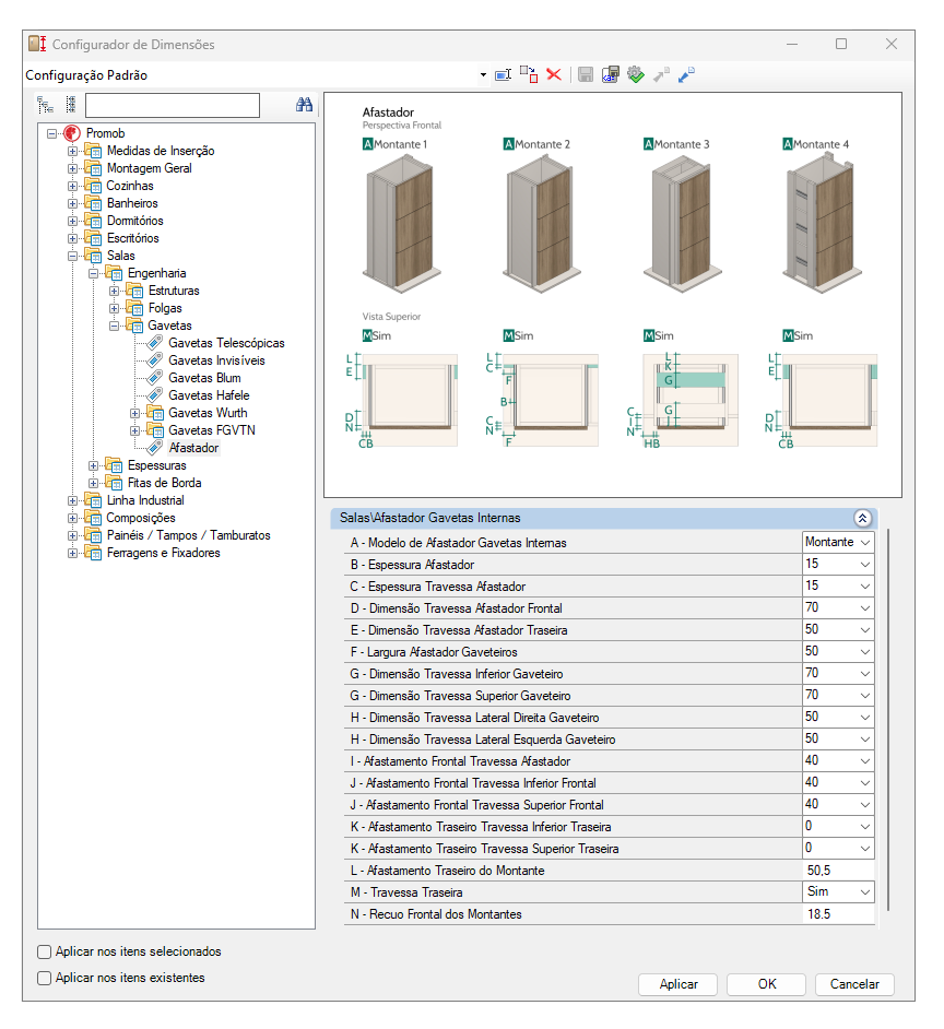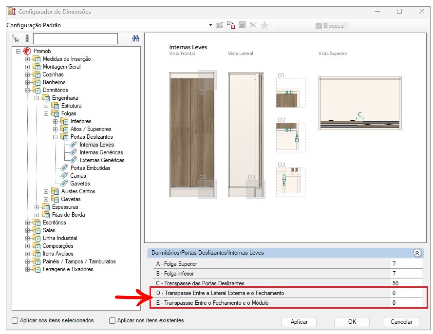 1. Em Dormitórios foram movidos os parâmetros (D – Transpasse entre a Lateral Externa e o Fechamento e o E – Transpasse entre o Fechamento e o Módulo) da aba Folgas – Internas Leves e Folgas – Internas Genéricas. É possível configurá-los pelo novo caminho: