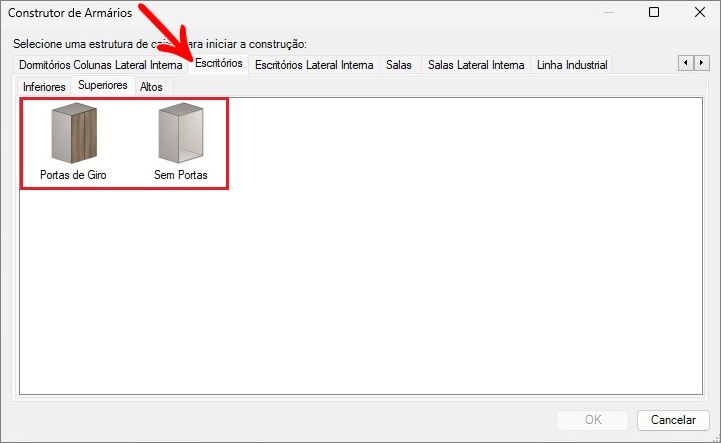 1. Incluída nova aba Superiores e Estantes na linha Salas, com módulos de armários superiores e estantes abertas e fechadas. Os módulos estão organizados em duas categorias: Lateral Externa e Lateral Interna. Configuração disponível nos seguintes caminhos: