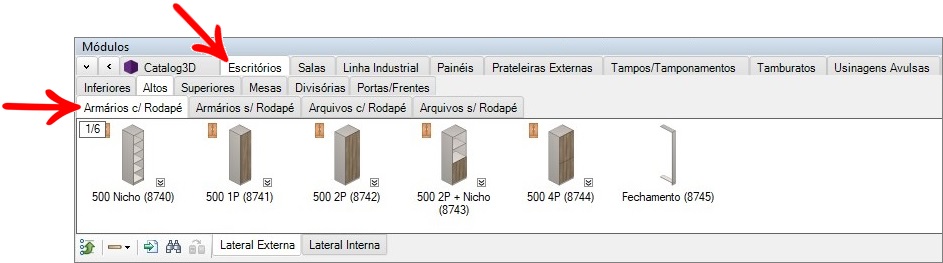 1. Disponibilizada nova aba de Inferiores na linha Salas composta por módulos de Balcões c/ Rodapé, Balcões s/ Rodapé, Gaveteiros c/ Rodapé e Gaveteiros s/ Rodapé. Além disso, dentro de cada uma delas, os módulos ficam separados entre Lateral Externa e Lateral Interna. Os novos módulos podem ser configurados nos seguintes caminhos: