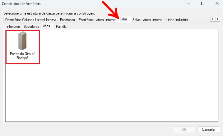 1. Disponibilizados novos módulos Inferiores, Portas de Giro s/ Rodapé e Portas de Giro c/ Rodapé, que podem ser encontrados no Construtor de Armários nas linhas Salas e Salas Lateral Inteira. Os novos módulos podem ser configurados nos seguintes caminhos: